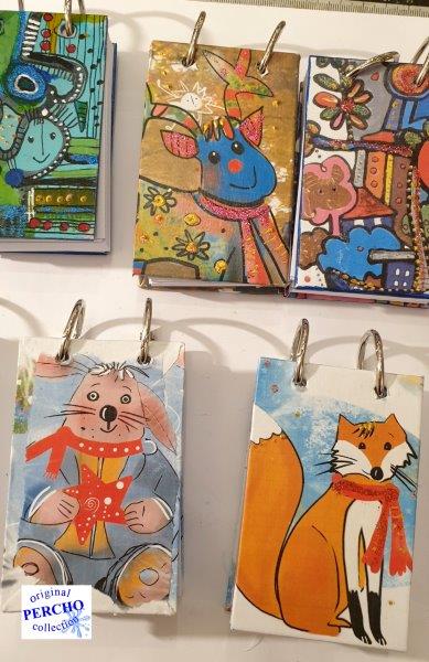 Petits carnets faits "maison" avec de la récup de papiers, de cartons, "habillés" de mes dessins, essais ou peints directement en fonction de l'esprit du moment. Tous différents, bien sûr!