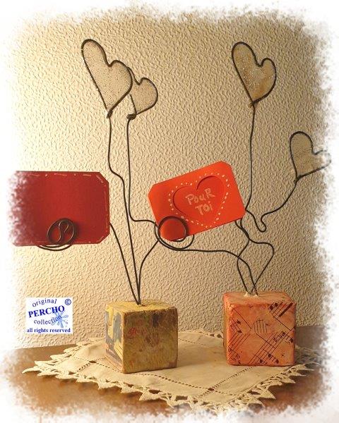 Porte-photo, porte petit mot doux à destination d'une personne que l'on aime. Technique mixte-fil de fer-acrylique sur petit plot ancien. Pièces uniques.