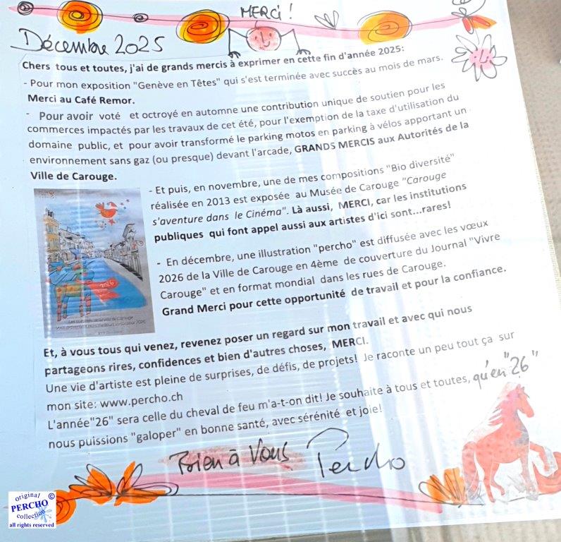 Résumé rapide de ma fin d'année 2025: Une fin d'année bien occupée.Mon travail voyage ici et là.La Ville Carouge et ses Autorités m'ont confié la création de leur "carte" de vœux pour 2026. Mais attention pas au format carte postale! Non au format.. mondial(!) Rien que ça! Les affiches sont à découvrir dans les rues de la Cité sarde. MERCI à la Ville de Carouge de faire appel aux artistes d’ici.