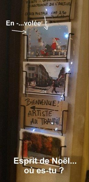 19 décembre 2025eh oui, ce n'est "qu'une" carte, mais elle a été volée... Les cartes qui sont dehors sont des spécimens de présentation. Comme elle était dehors depuis plusieurs jours, elle était défraichie, voire abimée. Cette carte volée va probablement être offerte à quelqu'un. Elle le sera avec ses taches,ses bords cornés et...mon nom, soit le nom de l'édition de cartes PERCHO. La personne indélicate a non seulement volé la carte mais ensuite elle transmettra mon nom entaché. Cela me fâche d'autant plus, puisque je veille à réaliser correctement & proprement mes cartes avec un travail main qui les rendent chaque fois un peu différentes. Eh oui, ce n'est qu'une carte, mais c'est le résultat d'un travail patient,créatif. Je ne comprends pas les personnes qui font ces gestes. Et vous savez quoi ? Pour tout vous dire, dans l'arcade, le chapardage existe aussi, par des personnes qui regardent, qui touchent tout, qui plient les cartes et qui "adooooorent la papeterie". GRRRRRRR! Où est donc l'esprit de Noël? Au fond du portemonnaie et des esprits embrumés qui ont perdu les valeurs liées au respect?