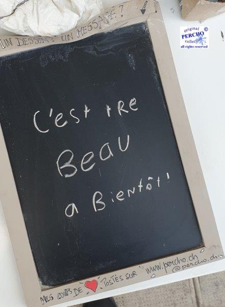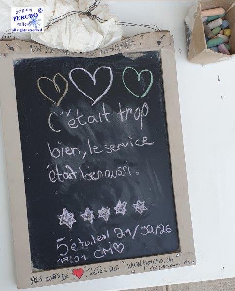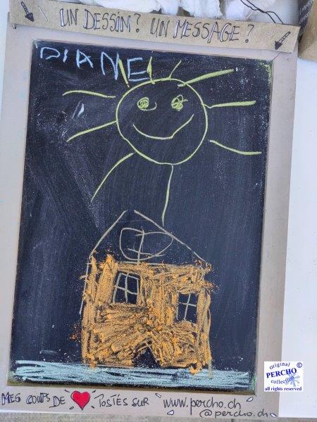 Devant l'arcade Percho, il y a une table avec une petite ardoise Je découvre vos réalisations, faites minute, juste avec quelques craies et votre imagination. Et parfois, sur mon livre d'or, d'autres dessins arrivent aussi. Merci à vous tous qui passez, qui vous arrêtez et prenez quelques instants pour dessiner ou laisser une message. La créativité est source de joie! Si vous le souhaitez, publiez votre dessin sur vos réseaux sociaux en ajoutant @percho.ch Certains dessins pourraient recevoir une surprise de ma part